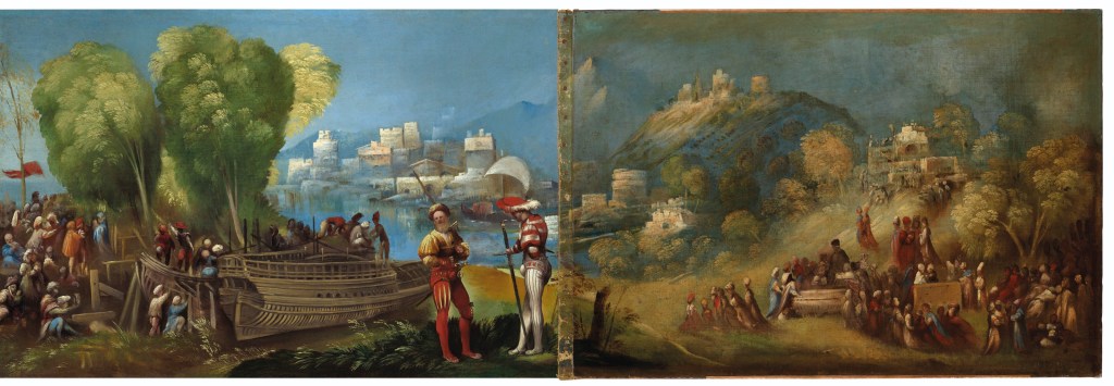 Originally commissioned by Alfonso I d’Este (1476-1534), this panel (right) was sold at Christie’s and has an absolutely illustrious provenance worth a click to the lot description. The frieze corresponds to a painting at the National Gallery of Art (left) and the canvas was one of ten paintings portraying scenes from the Aeneid commissioned by Alfonso d’Este for his Camerino d’Alabastro in Castello Estense. Thankfully, it was acquired by the NGA and reunited with its counterpart.