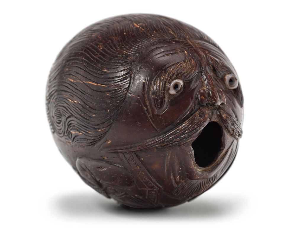 A wood baton with a carved grotesque mask finial mounted with bone; A preserved crows head with beak; A silver-metal pendant and chain, the pendant cast with a dragon and verso engraved with a star motif and the word SATAN; A small hand-stitched cloth ‘Voodoo’ doll, fixed to a board, with nails and pins, in linen bag; A cut length of plaited hair; A pressed metal ‘claw’ spangle; A miniature Venetian glass goblet, from a dolls house; and A black scrying mirror in fold-over leather case.