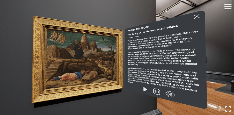 At the bottom of each caption are three clickable icons which provide an audio guide, a 3D model experience, and a link to their respective catalogue entries on the National Gallery website. The first and last things are rather straightforward; it is the middle item which is unfortunately a little flawed but also quite interesting.
