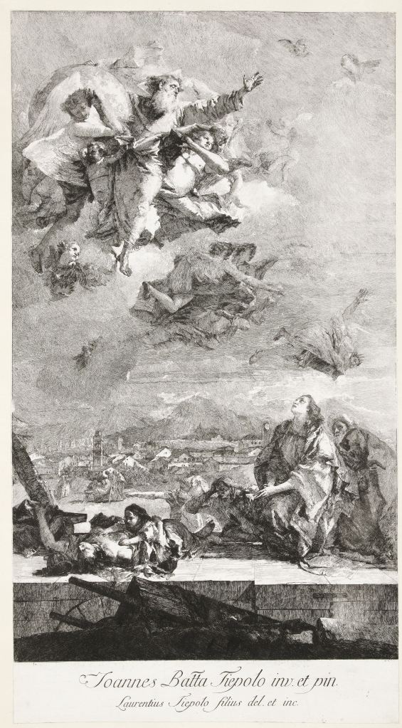 - Lorenzo Baldissera Tiepolo, after Giovanni Battista Tiepolo, St Thecla Praying for the Plague-stricken, 1759 – 1776. Etching on paper, 694 mm × width 377 mm. Rijksmuseum, RP-P-1950-640