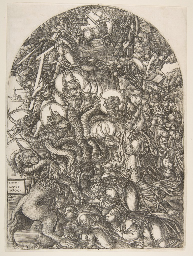 - Jean Duvet, The Beast with Seven Heads and Ten Horns from The Apocalypse, n.d. Engraving on paper, 12 3/16 x 9 in. (30.9 x 22.9 cm). Metropolitan Museum of Art, Harris Brisbane Dick Fund, 1925, 25.2.81