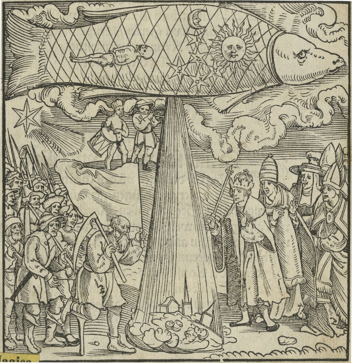 - Woodcut of a “comet” from Des Monstres et prodiges by Ambroise Paré, included in Les œuures d’Ambroise Paré, conseiller, et premier chirurgien du roy : Diuisees en vingt sept liures, auec les figures et portraicts, tant de l’anatomie que des instruments de chirurgie, et de plusieurs monstres. Paris: Gabriel Buon, 1579. Wellcome Collection.
